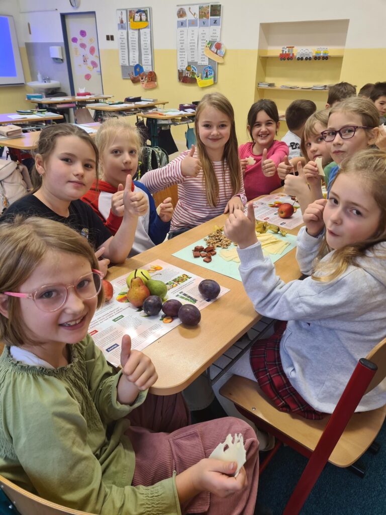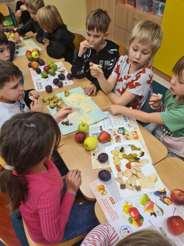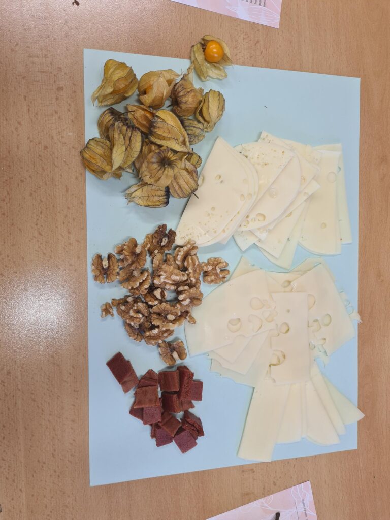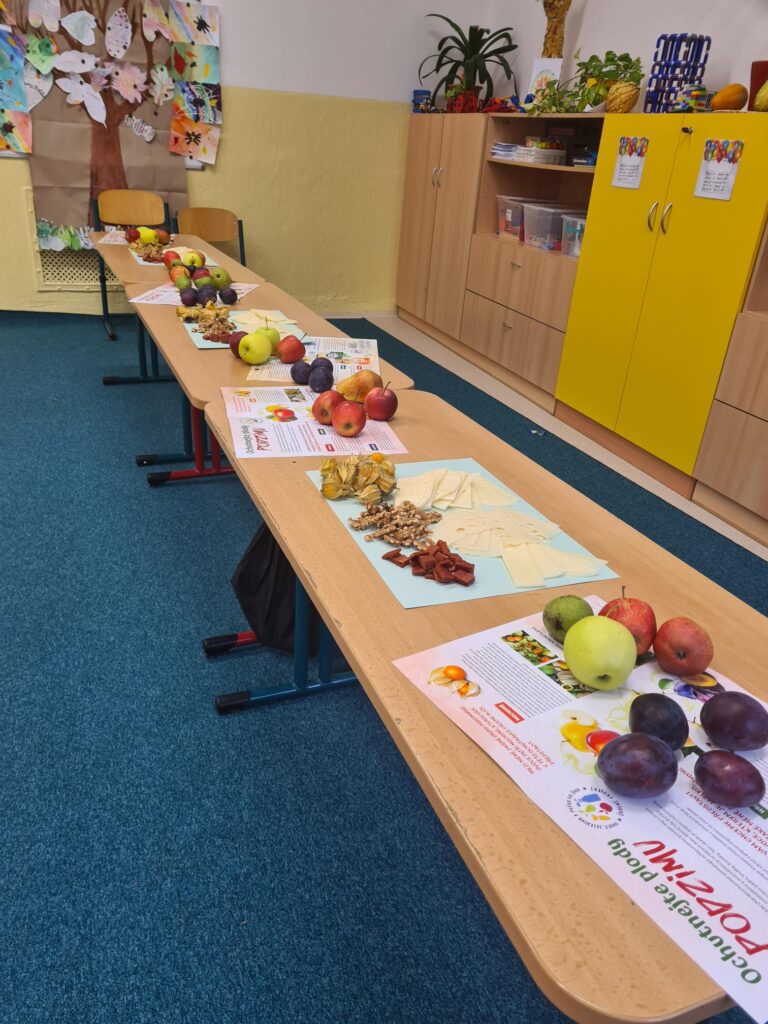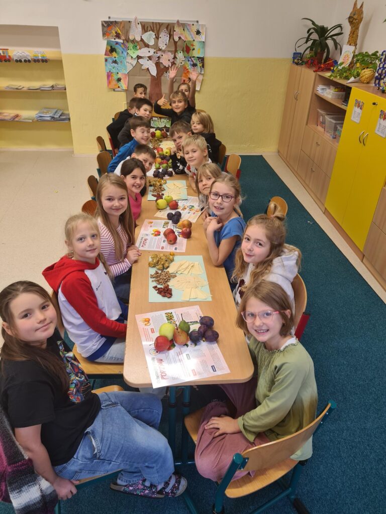 V rámci školního projektu „Ovoce, zelenina a mléko do škol“ jsme s dětmi uspořádali ochutnávku různých zdravých potravin. U velkého stolu jsme společně ochutnávali ovoce, sýry i ořechy. Zkusili jsme si také poznávat jednotlivé potraviny pouze podle chuti – bez pohledu. Děti měly možnost objevovat nové chutě, sdílet své dojmy a povídat si o tom, co jim chutná a proč. Aktivita byla nejen zábavná, ale také poučná – zaměřili jsme se na podporu zdravého stravování a rozvoj smyslového vnímání.