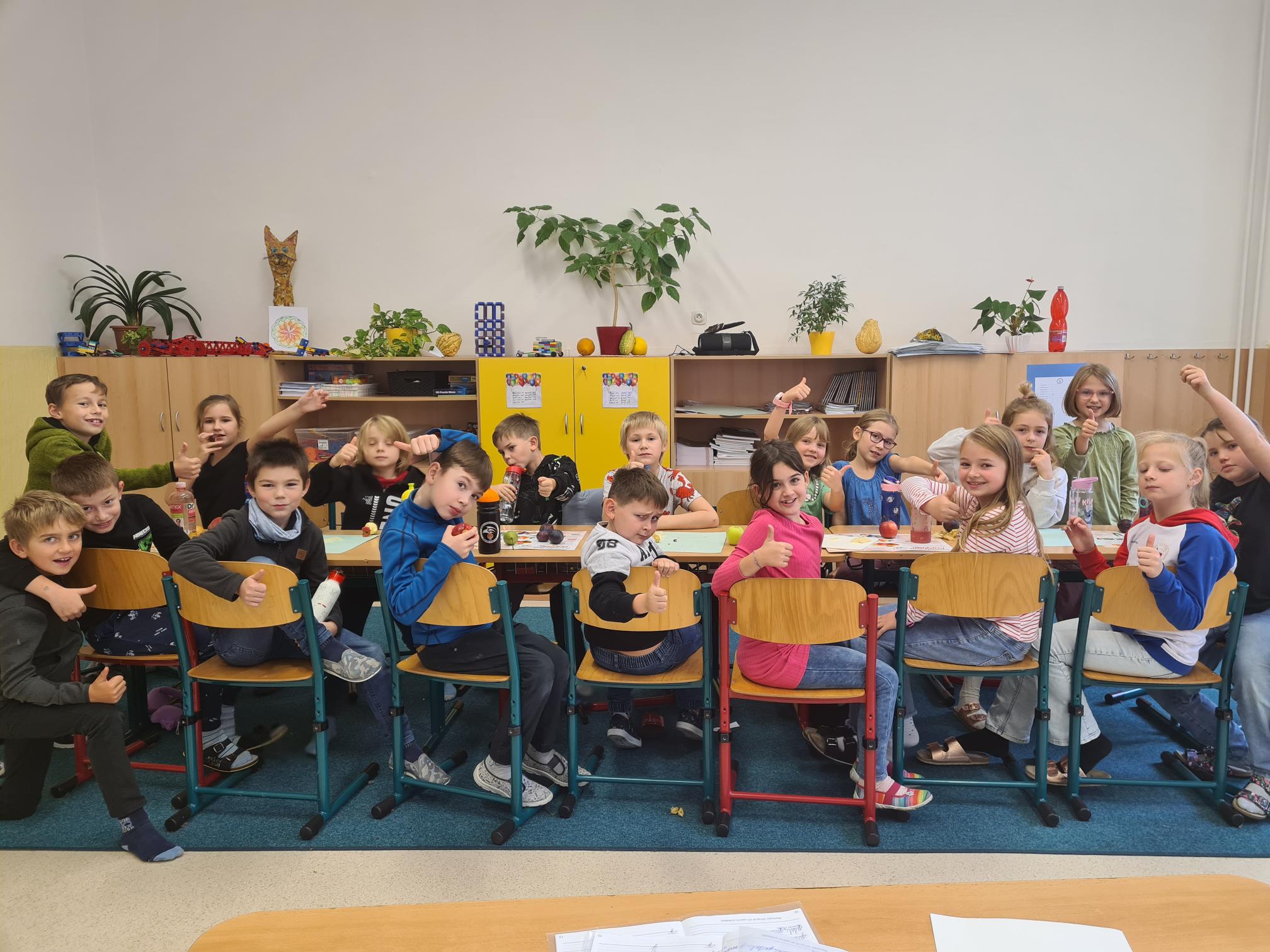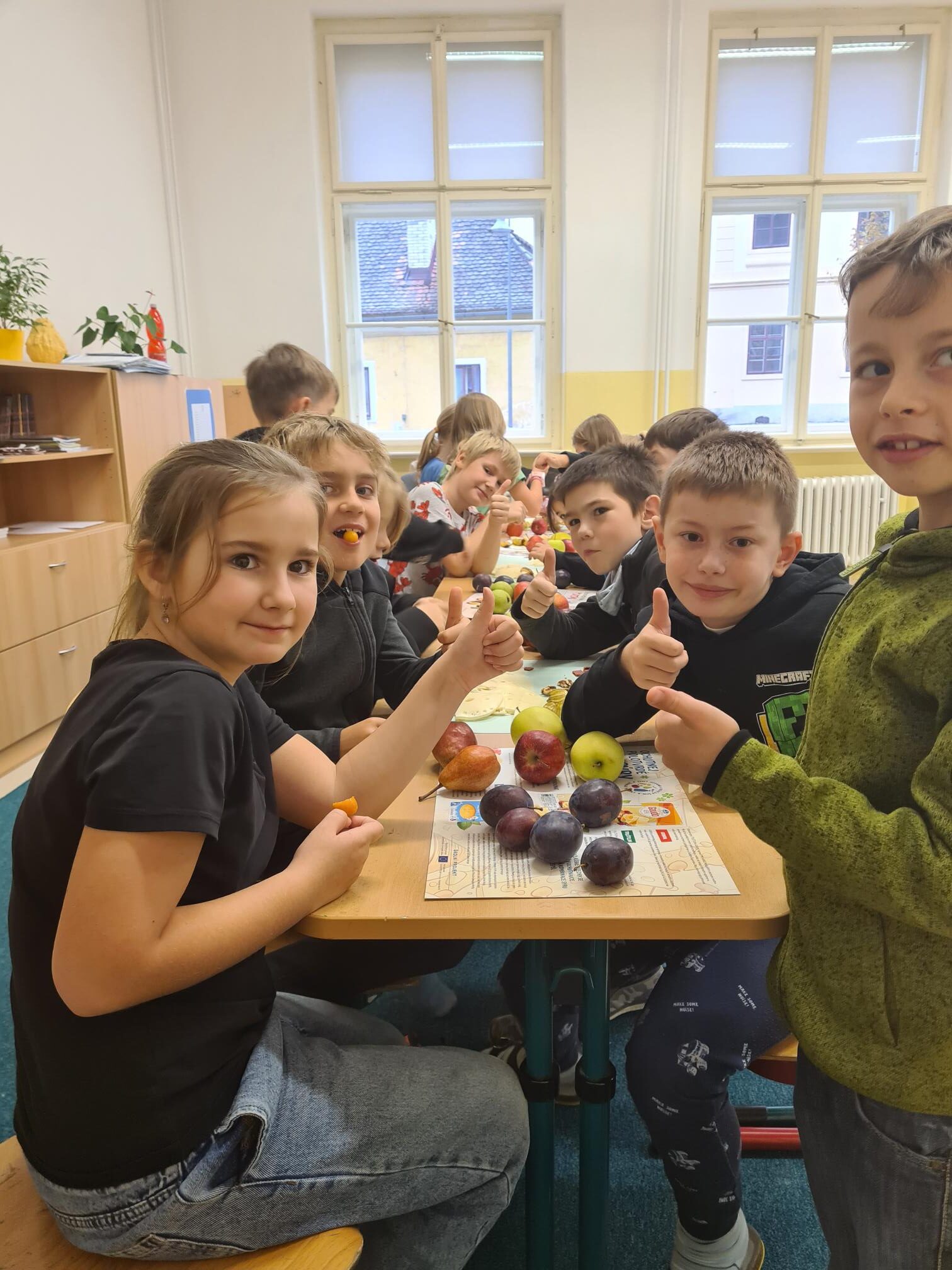 V rámci školního projektu „Ovoce, zelenina a mléko do škol“ jsme s dětmi uspořádali ochutnávku různých zdravých potravin. U velkého stolu jsme společně ochutnávali ovoce, sýry i ořechy. Zkusili jsme si také poznávat jednotlivé potraviny pouze podle chuti – bez pohledu. Děti měly možnost objevovat nové chutě, sdílet své dojmy a povídat si o tom, co jim chutná a proč. Aktivita byla nejen zábavná, ale také poučná – zaměřili jsme se na podporu zdravého stravování a rozvoj smyslového vnímání.