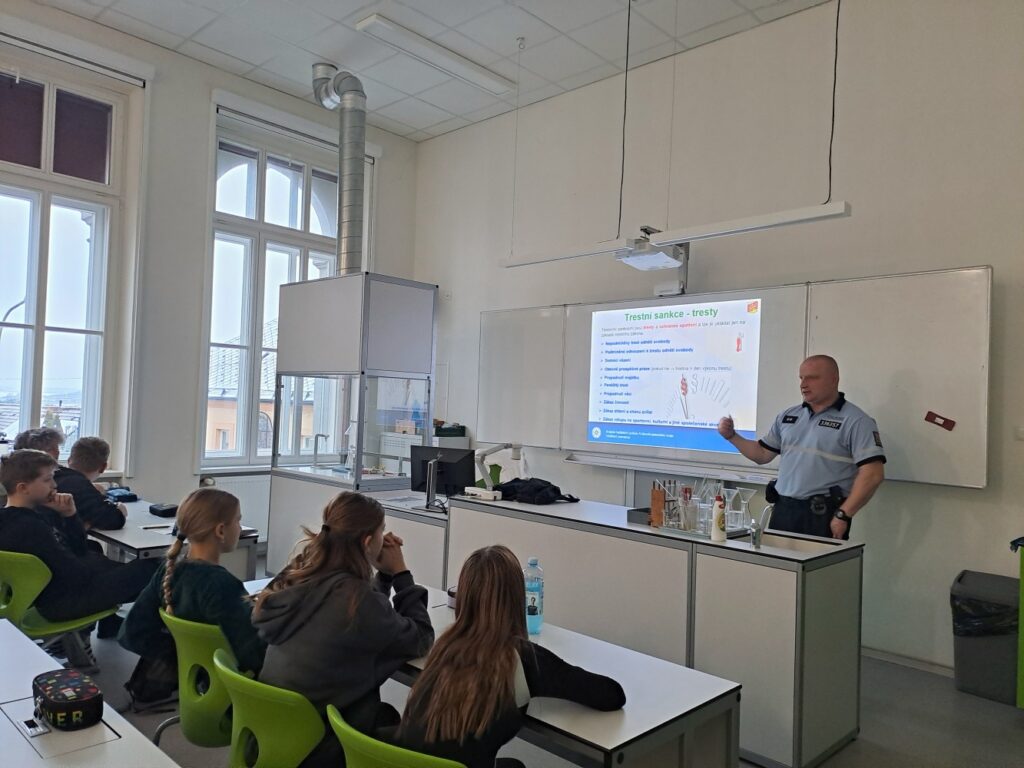 Žáci 7. tříd absolvovali v rámci získání povědomí o odpovědnosti za své chování a jednání z pohledu práva přednášku vedenou por. PhDr. Jaroslavem Matouškem, preventistou Policie ČR. Obsahem přednášky bylo osvětlení pojmů souvisejících s touto problematikou, objasnění rozdílu mezi přestupkem a trestním činem, seznámení s postupy při provinění dítěte, mladistvého a dospělých a jejich řešení, funkce a úloha Policie a soudu v ČR a mnoho dalšího. Cílem přednášky bylo žáky seznámit s tím, že každý má nejen práva, ale i povinnosti, je odpovědný za své činy a musí nést následky svých rozhodnutí a konání.