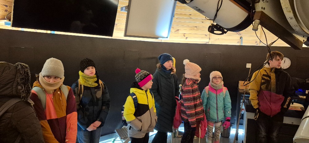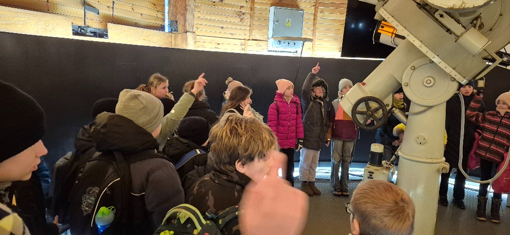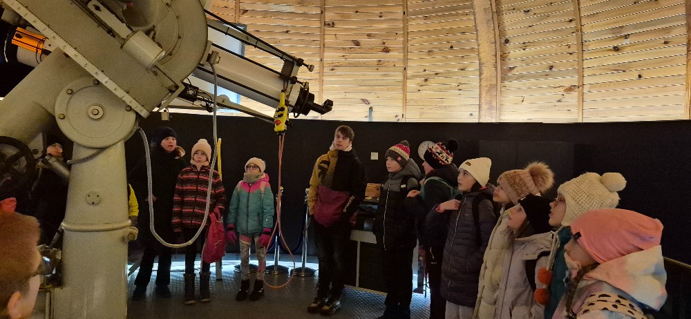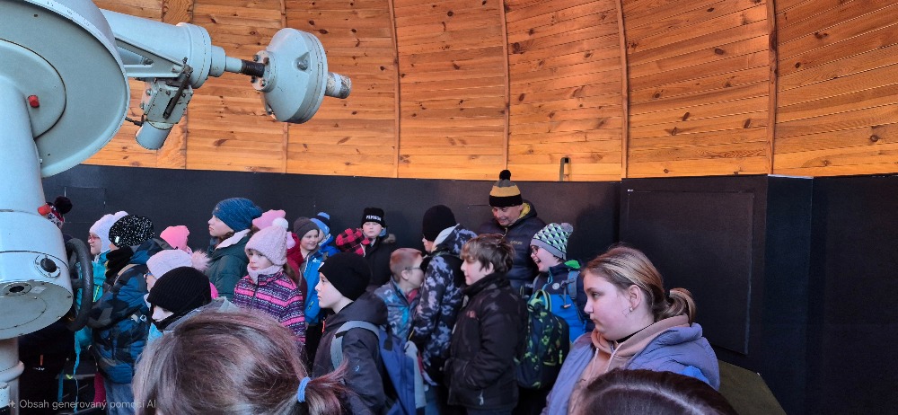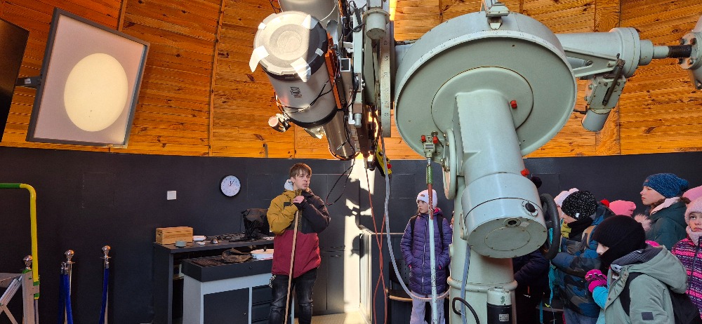 Ve druhé části programu následovala prohlídka dalekohledů. Žáci si mohli zblízka prohlédnout různé typy přístrojů a dozvědět se, jak fungují a k čemu se používají. Mnohé překvapilo, jak velké a technicky propracované dalekohledy jsou.
